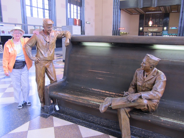 The Durham Museum is housed in the old union station just south of the Old Market place so this was one of those rare on-the-road days without being in the car. The museum celebrates the history of Nebraska and especially its transportation. One impressive thing about the museum was all the bronze life-size statues throughout the building. Above are a couple of them. No, that beautiful lady in the orange coat was not a bronze that is my wife. The last sentence reminds me of that wonderful quote “no, he’s not heavy; he’s my brother” because tomorrow we will be going to Boys Town for a visit.