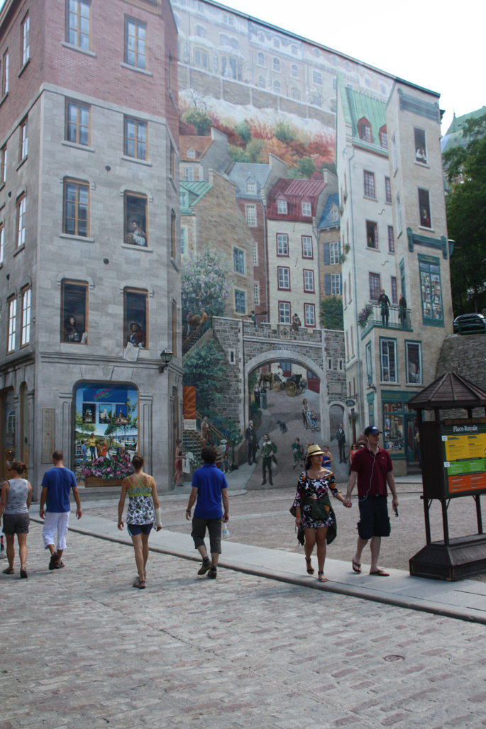 When we visited our neighbors to the north in 2011 we came across many things that we had not seen before the this mural is one of them. The whole side of the building is a painting. It is all make-believe. I spent perhaps a half hour just taking it in. Click on the pic to see a larger view with more details….