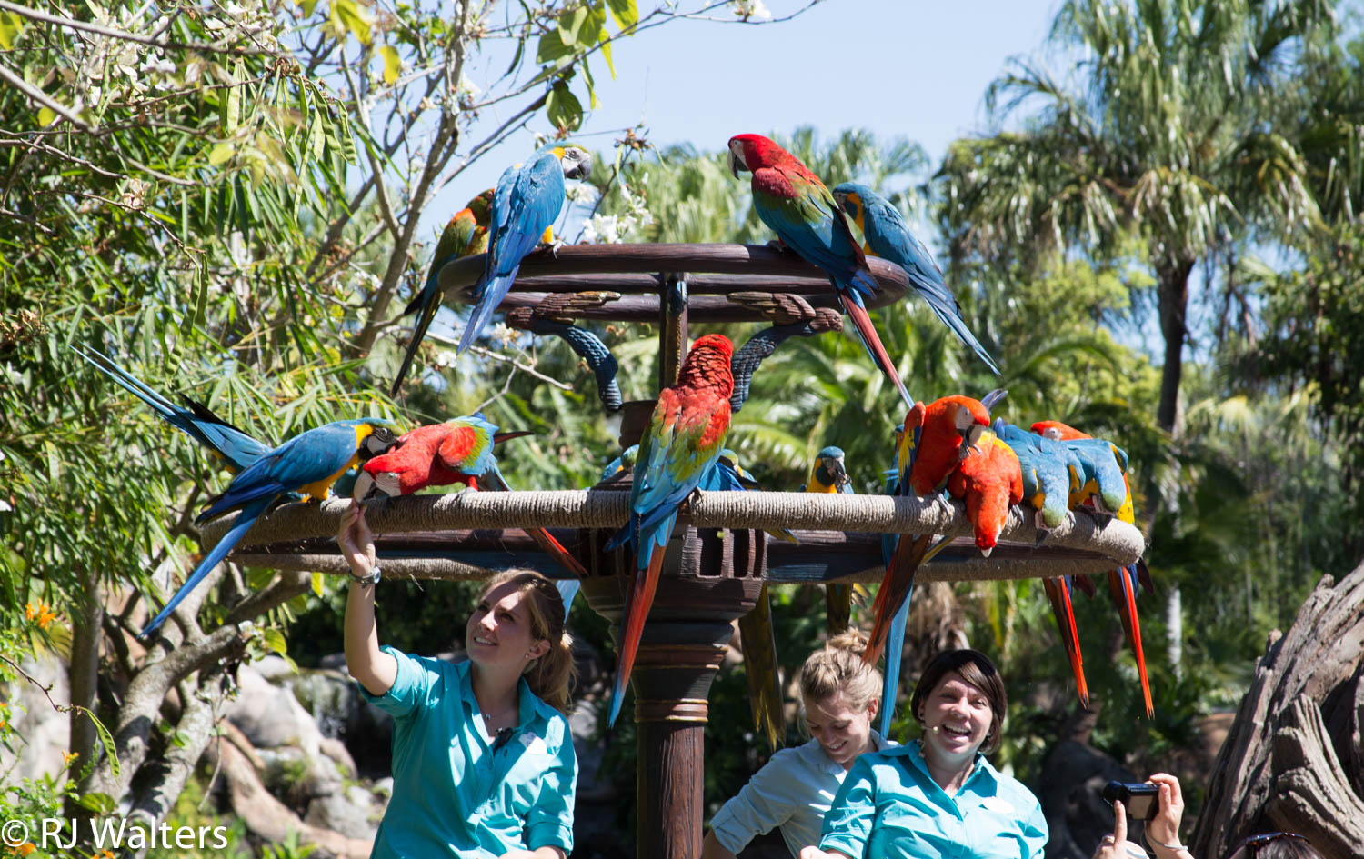 I have to say that Disney World does it right. They go out of their way to insure that everyone has a good time. One of those unique experiences was the McCaws at Animal Kingdom. A dozen birds seem to land on command so these smiling young ladies can tell us about them and of course so we can take pictures. Then a few minutes later they all take flight only to return a few hours later for more guests.