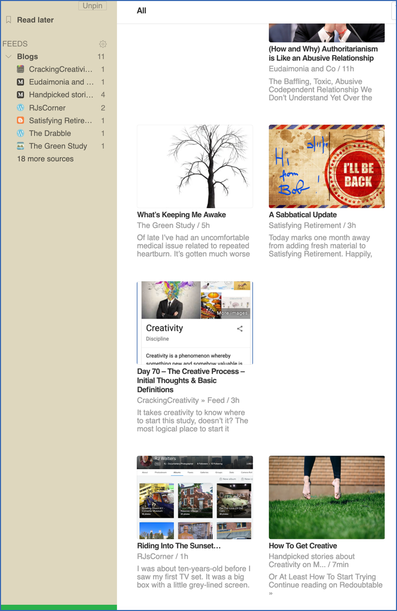 All I have to do every morning is to open Feedly in my browser and all the unread blog posts from my twenty or so favorite sites show up. It gives me the list and a snapshot of what the post is about. When you find a new blog you want to add to the list it is simple to add it. See the image below: