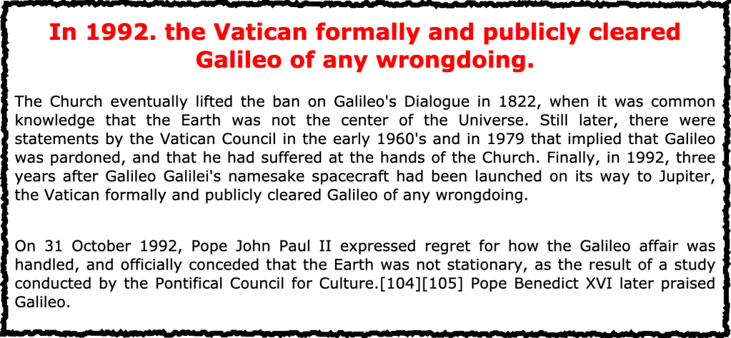 One thing I have discovered from my study of religious history is that they move at the speed of frozen molasses when it comes to admitting they got it wrong. It took more than three-hundred years for the Catholic Church to official acknowledge that the earth is not the center of the universe. In the news article shown below Pope John Paul said that the 17th-century theologians were just working with the knowledge available to them “at the time”. Those words were probably as close as we will ever get to a religious establishment leader admitting that much of church doctrine was established by men, not God.