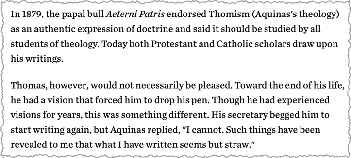 Thomas Aquinas who lived in the 11th century was the author of much of current Christian doctrine and tenets. But that fact is little known by most church members. Another little known fact is that he had serious doubts in his final years about what he had spent his life writing. See more about that in the box below.