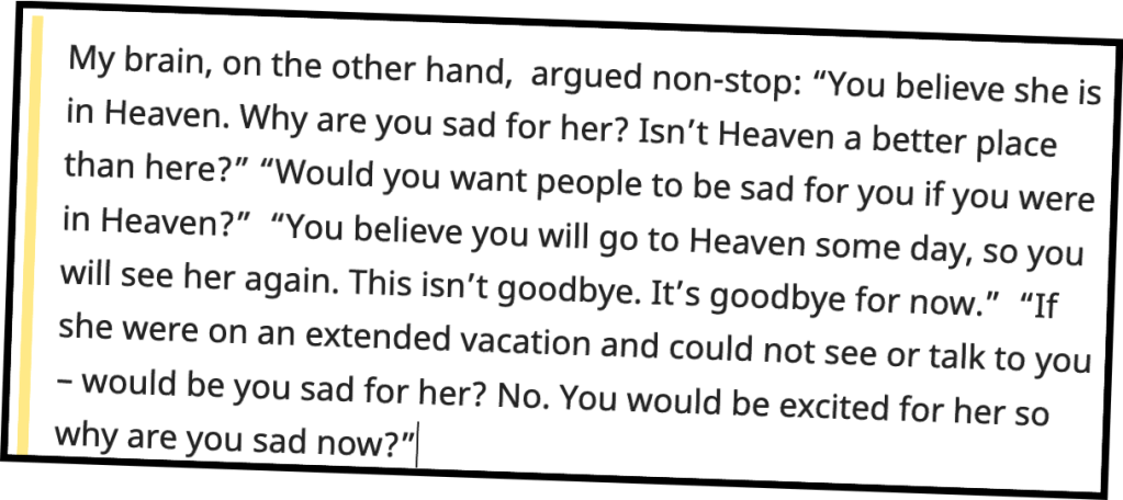I think most sorrow comes for what we all miss with the person. We have to let those go- sometimes slowly. The Jewish religion gives people a year. Islam says 24 hours. That is why the funeral is for the living not the dead.