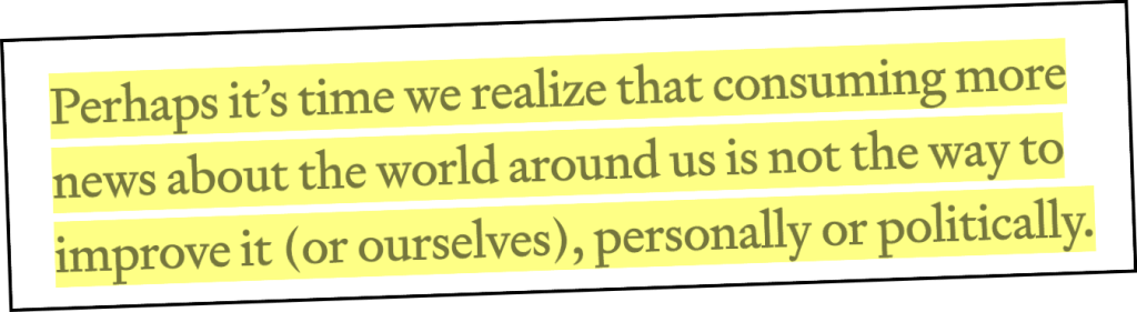 According to a recent report 95% of American adults follow the news regularly, even though more than half say it causes them stress and two-thirds say the media blow things out of proportion. I very much see myself very much in this group.