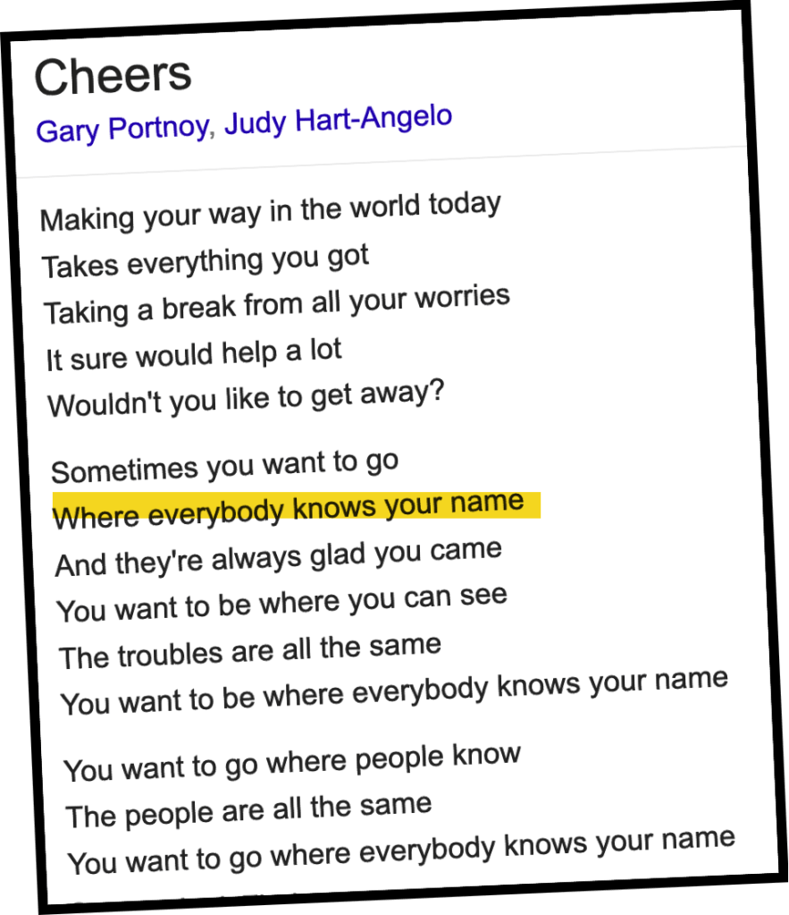 Cheers was the name of a TV show produced between 1982 and 1993. That is just yesterday to me but I realize that many around were not even born then. 🙃 It took place in a bar in Boston. The main reason for the show’s success was the diversity of characters that came and went. The theme song was the perfect profile for the show. Here it is.