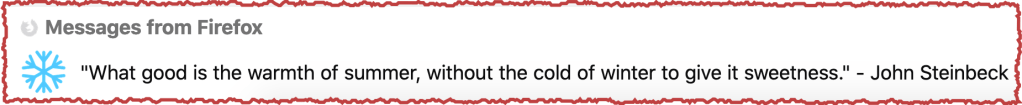 Getting slightly off track, I recently turned on an option on my Firefox browser to give them permission to put short messages from the Manzillo Foundation at the bottom of the browser during my morning login. I’m glad I did. The quote above from one of my literary heroes was the first one I got. It helped me to remember that I need to keep things in perspective even when it comes to winter.