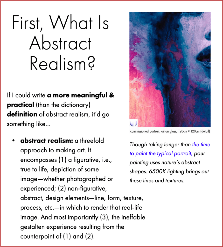The abstract part is where many of us get lost. We say “I just don’t get it?”. Most often that is said after we our creativity has been squashed by one thing or another. For me, it was my engineering education fifty years ago. It was thoroughly ground into me that if it isn’t real then it is fake. Even after all these years I still can’t say I get it. That’s where abstract realism comes in for me personally.