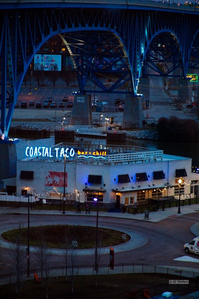 For this Abstract Realism post, I chose the Coastal Taco in Cleveland Ohio. The picture was taken just after sunset from our room at the very eclectic Aloft Hotel. As you can see the restaurant was under a very large bridge going across the Cuyahoga River near Lake Erie. The photo did’t require much tweeking to put it in the abstract class. The food was pretty good and the inside atmosphere was delicious. 🙂