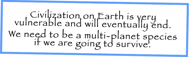 There are a few people on earth who can think long term and then actually make it happen. Elon Musk is one of those people. The quote to the right is one of the primary reasons for SpaceX. I don’t really know how he came about this fundamental belief, but I know how I did and that is what this post is about. 😎