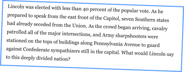 The first quote was included in the final sentence of Abraham Lincoln’s first inaugural address. He was pleading with the South to come to their senses and back away for the idea of a civil war. Here are some words from an NPR article from 2011