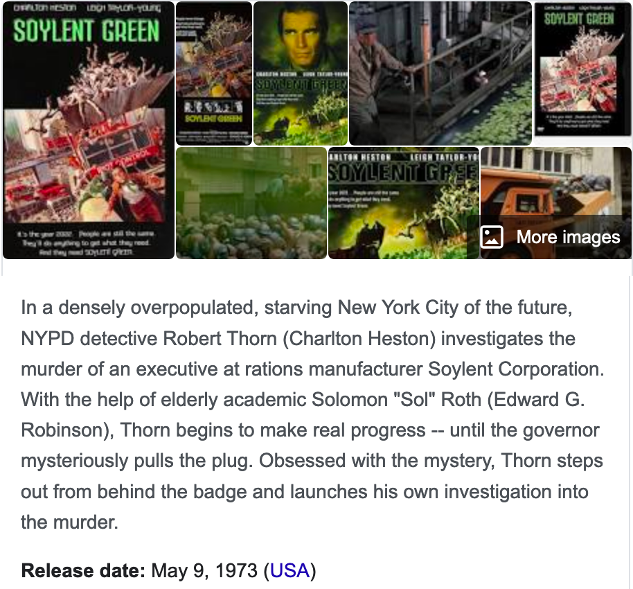 This brings back a vivid image of the movie “Soylent Green” from 1972. I know that was almost 50 years ago, but it still sticks in my memory. A little about that movie is shown to the right. I can still see the image of “Sol” lying on a silk sheet covered bed looking with wonder at how earth used to be. He was giving up his life so that he could be turned into Soylent Green nutrient pills for the population of New York. Yeah, Soylent Green is people! That was the shocking end of the movie. 🤪
