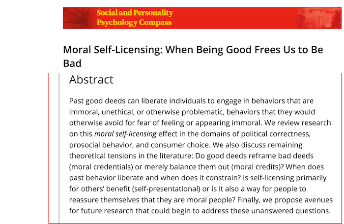 When we believe we are generally doing good in one area we tend to give ourselves a pass on other immoral behaviors.