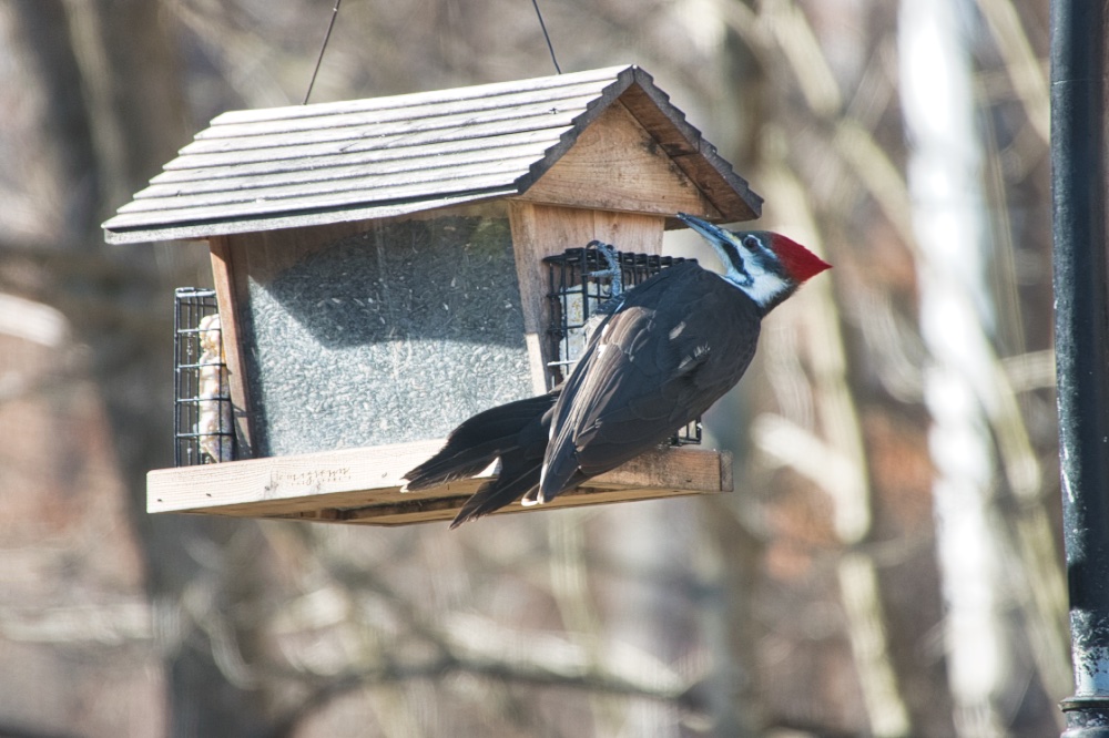 This Sunday I hope to make all you bird lovers envious of a new neighbor that now frequents my feeding station. Pileated Woodpeckers are very reclusive. Up until now I have seldom seen one more than a couple times a year. However this young female is becoming a regular, that is as long as I have suet our for her. Eat Your Hearts Out…