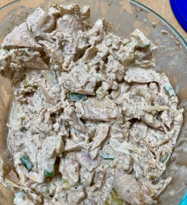 Just mix everything together and chill. I have kept it in the refrigerator for over a week now, and it is as good as the first time. Btw – I used Sam’s Club rotisserie chicken because I always get one when I visit Sam’s. At $4.98 for a whole chicken it is quite a bargain. I feed the white meat to my cat and wife, they both prefer that dry stuff. I will proclaim that this is the best chicken salad I have ever eaten.