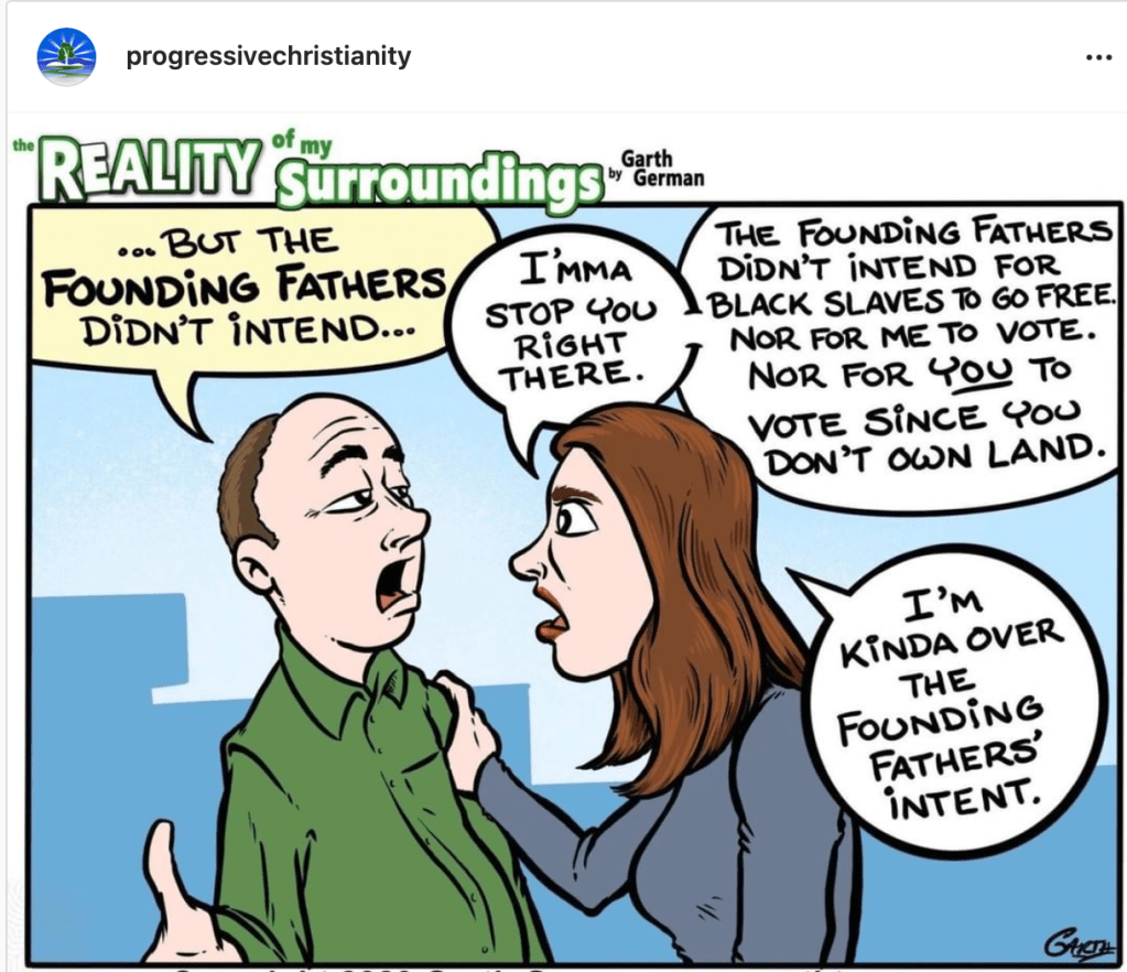 The cartoon above from ProgressiveChristianity is probably the most effective way to counter those like the previous Supreme Court Justice Scalia. He proclaimed that he always looked at the constitution as what the founding father intent was. In other words he viewed the world with 18th century eyes and ignored anything since then.