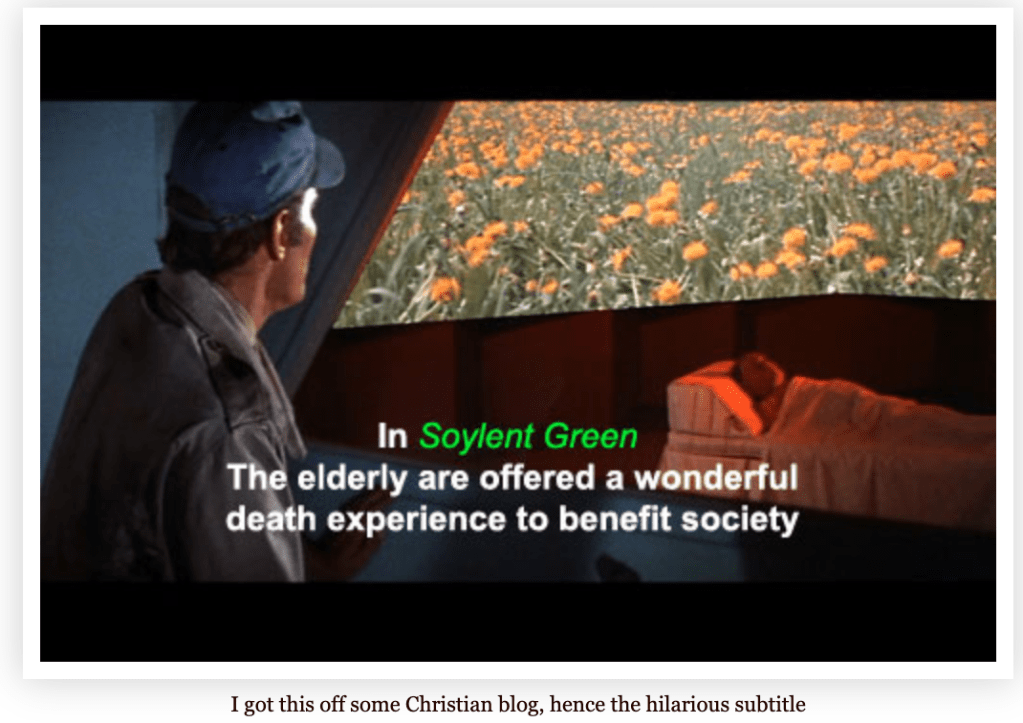 I still remember the scene in the 1973 movie “Soylent Green” where Edward G Robinson was laying on a bed with silk sheets looking at pictures of what the world looked like in the good-old-days before everything fell apart. That was part of the process of bringing in old people to be turned into food (Soylent Green) for every one else to eat! I know that is a spoiler for the movie but since it is almost 50 years old, I don’t suspect it is the first time. 😎