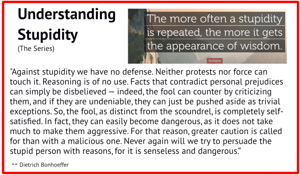 As promised on my December 23rd post, this is the first in a series about Stupidity. It might seem strange to make this topic for a weekly series, but stupidity has serious connotations for our times, as it did during Bonhoeffer’s time in Hitler’s Germany.