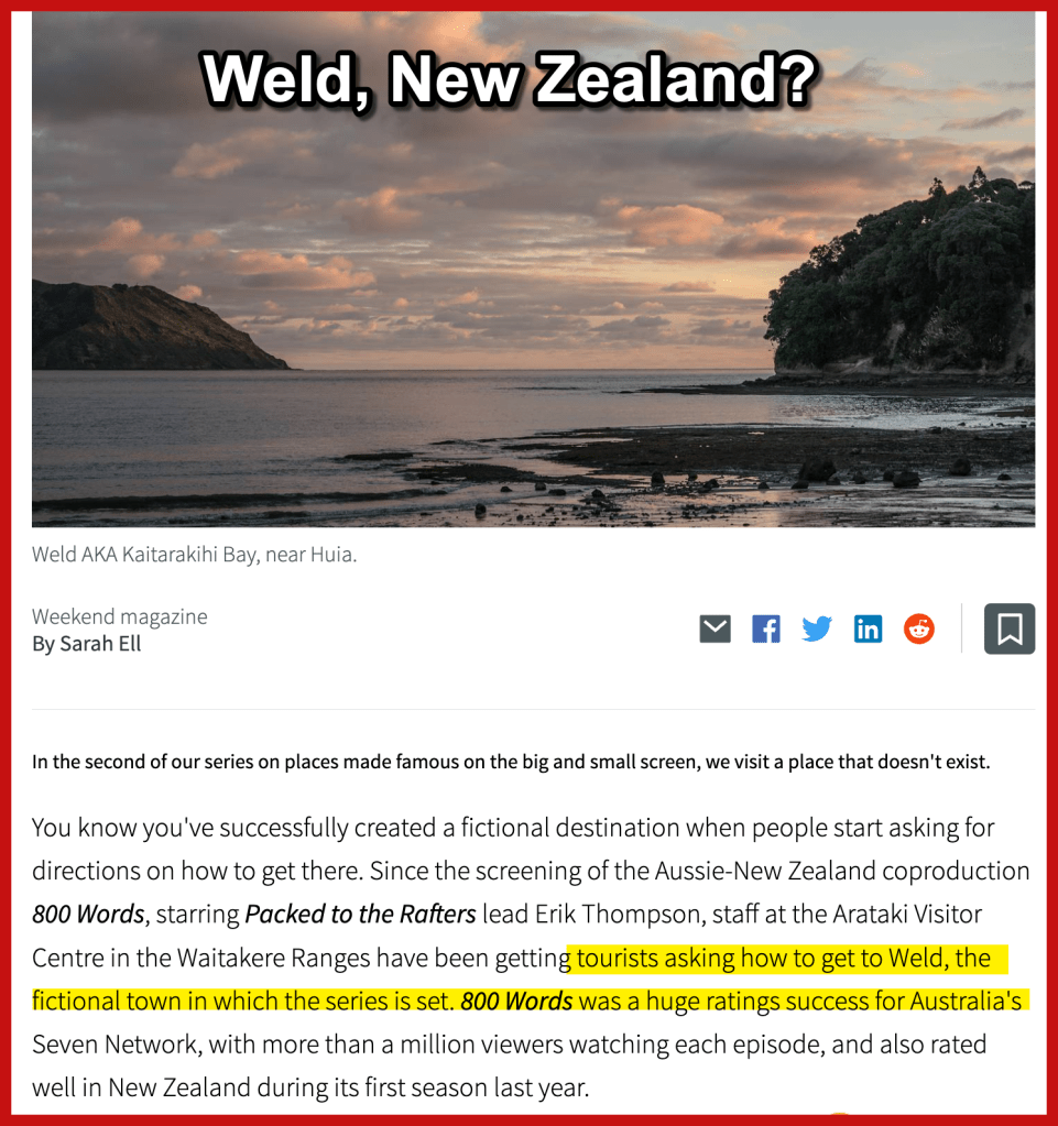 The town I have adopted is Weld, New Zealand. It only exists in the minds of the writers, but that is ok. If it were real, I would likely plan a trip there. But really the TV show is what I am adopting.