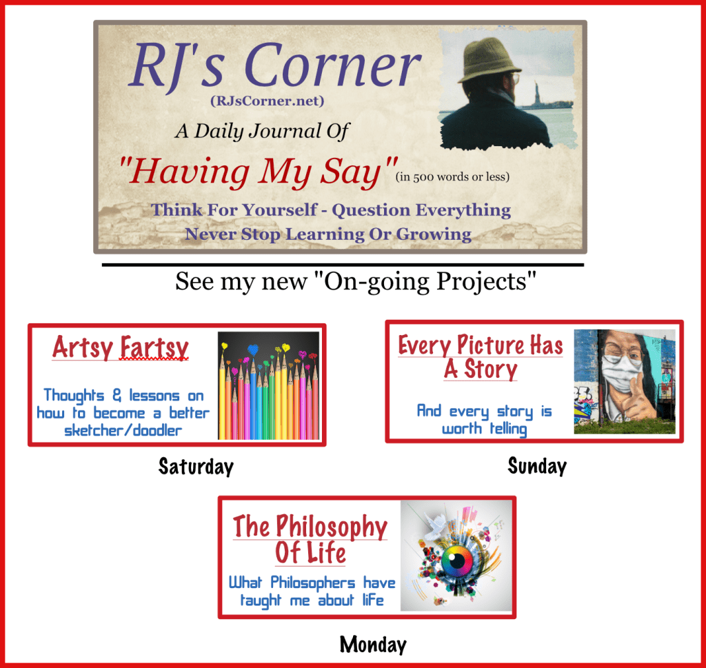 Artsy Saturday is a part of the trilogy of new projects I am starting at RJsCorner. The banner above shows the other two. For the most part, Saturdays, Sundays, and Mondays are now dedicated to becoming a better artist, storyteller, and thinker. Part of my “Never Stop Learning” mantra is to constantly become better at the things I cherish in life. This trilogy is definitely a big part of that subject.