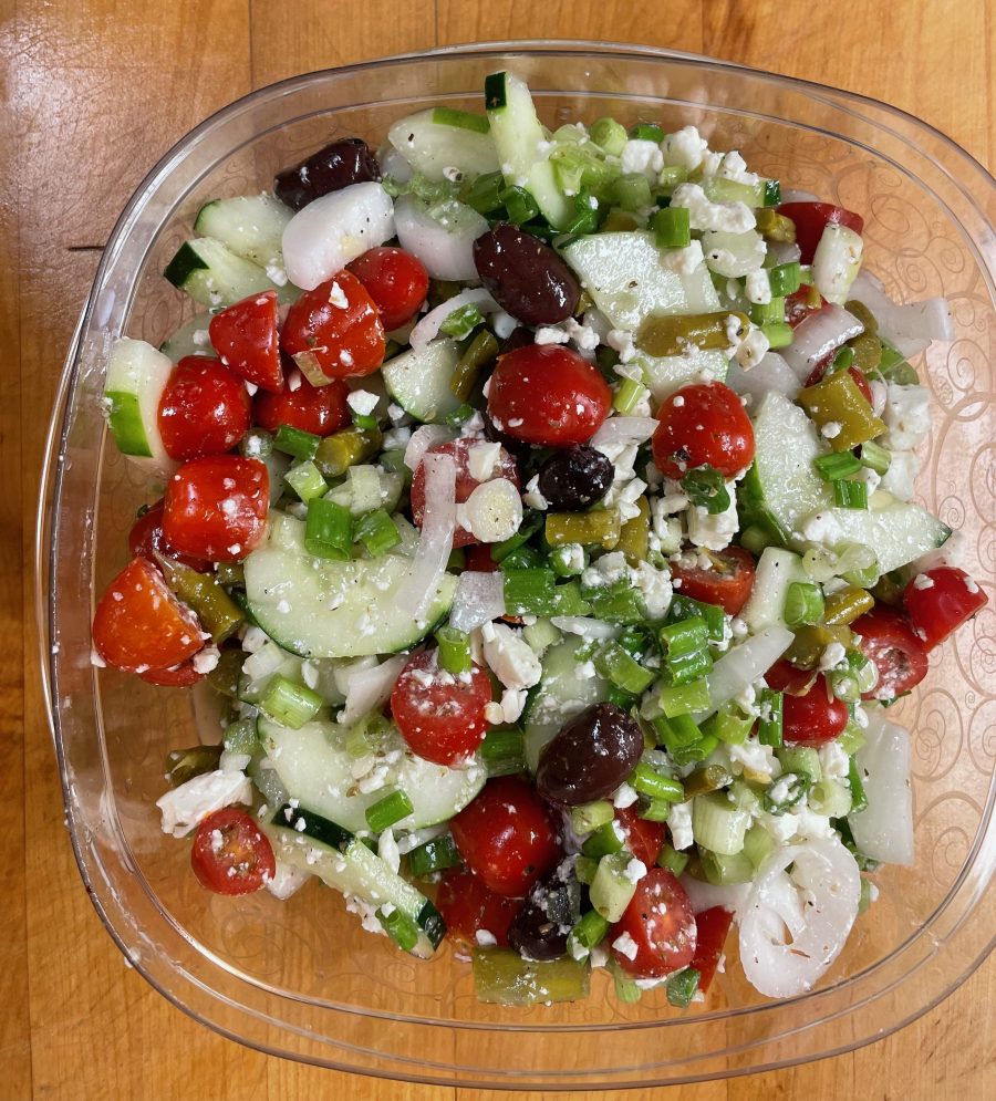 This is a simple dish that can be prepared in about 15 minutes. I think it tastes better if prepared and left overnight in the refrigerator before serving. I call this Greekish because some of the ingredients are not in the Greek version of the dish. The original recipe called for feta cheese, but I think Asiago cheese works better because it doesn’t break down so much if left in the refrigerator for more than a day or two. I also used vegetable oil as olive oil tends to jell if refrigerated. The Greek version doesn’t have scallions or asparagus, but I think they add a nice flavor, texture, and visual appeal to the dish. For the asparagus, just use small diameter ones ( I used pickled the pickled version) I put a little extra vinegar because I like things tangy (reduce the amount if you must). One final suggestion is before serving flip the container over to let the dressing drench all of the salad.