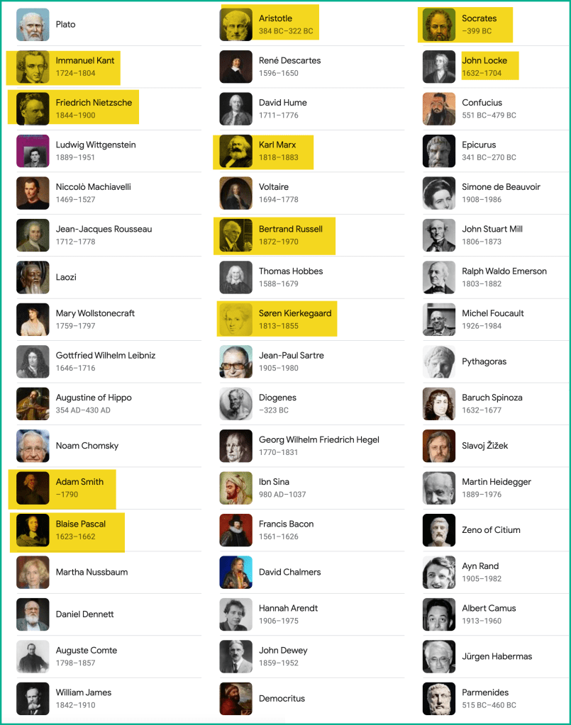 Here is a list of the most famous philosophers. My favorites are marked highlighted in yellow.