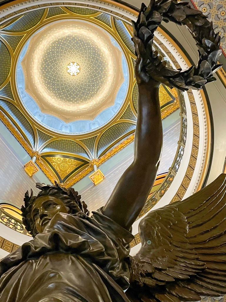 I have visited over 40 State Capitals in my travels around the U.S. and this is one of my favorite pictures. It is from the Capital Building of Connecticut in Hartford. I visited there during my recent trip through that beautiful State. I will have much more to say about that in an upcoming on-the-road post. At that time, I will give you a full picture of the statue along with many others.