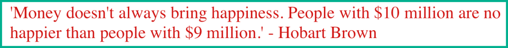 Those who have lots of money, just never seem to be any happier than the rest of us. I recently read an article, I think from the New York Times, that people who make an annual income of $100,000 and more just don’t think they can live happily on that amount of money. I come from humble beginnings, and continue to see money from that worldview.