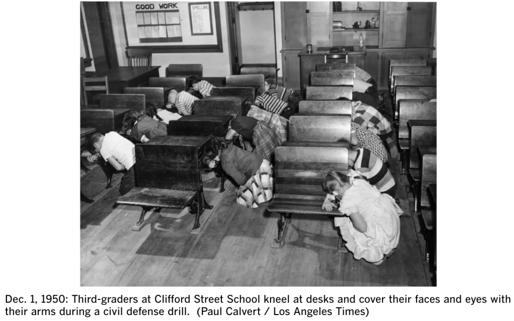We lived through the idea that a nuclear holocaust could come at any time. In grade school, we were taught that if a bomb was dropped, we would be safe if we just scrunched down under our schoolroom desks.