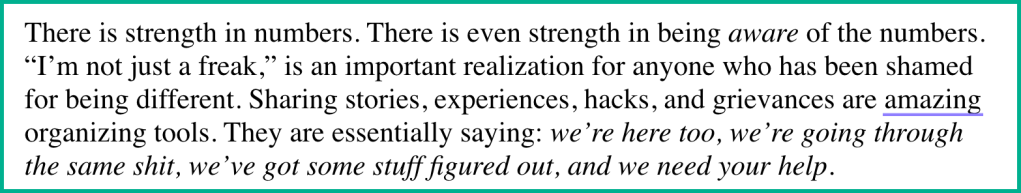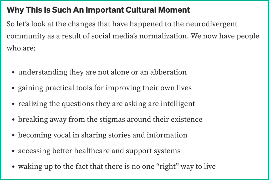 One of the advantages of social media is that it is now easier to find those others similar to us. One of those sites that facilitate that is the Medium. If you let it, Neurodivergence almost seems like the normal on that site. One of the neurodivergent people I recently read there is Vi La Bianca. Here is what she wrote on a recent post that got my attention