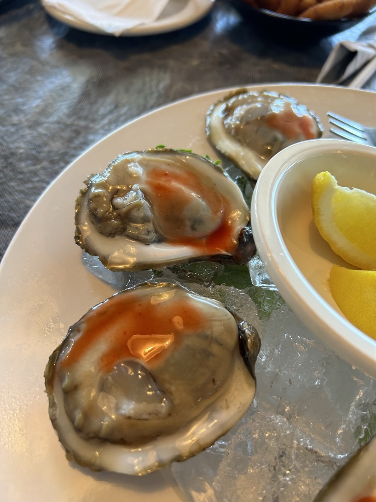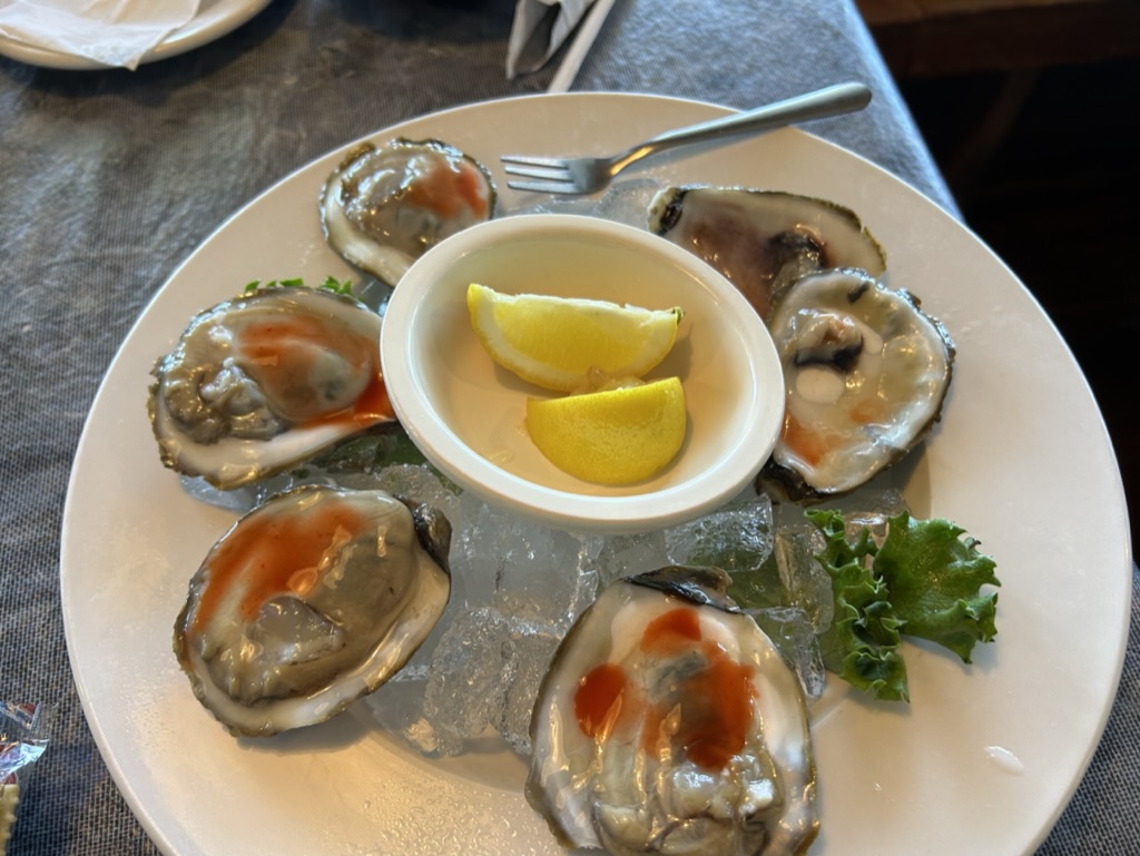 As I have mentioned, one of the expected highlights of this trip was to get some North Carolina oysters. During my four years in New Jersey to finish out my 30-year pension, I fell in love with oysters on the half shell, primarily the Chesapeake Bay version. Before my recent trip to NC, I had read about the “Marshland’s oyster trail” and was looking for at least three meals of them. I had researched several restaurants along the route, but when I visited, I failed to find any open. I was certain that when I reached New Bern, which is in the heart of oyster country, I would find my beloved oysters. New Bern seems the epitome of a seafaring touristy town with dozens of restaurants. Of all those places, I found only one that had oysters on the half shell, and it was closed. It only opened on Thursday through Sunday.