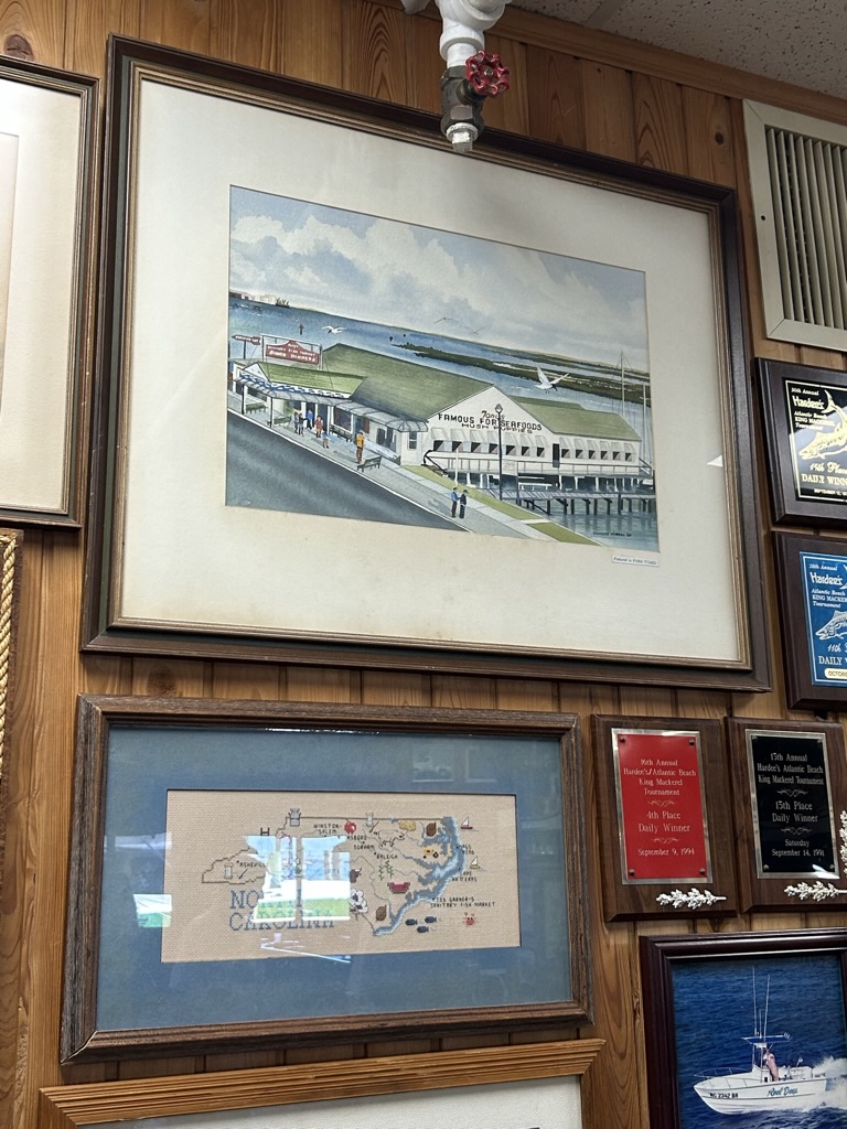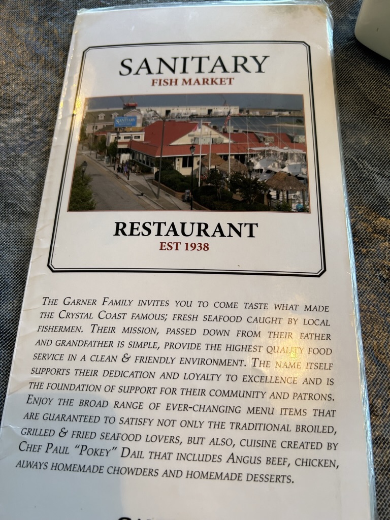Oysters were meant to be one of the primary purposes of the trip, but I found myself leaving the marshlands without having even one of them. But then I came across the “Sanitary Restaurant”. It was in Morehead City, NC. So, I thought, “what the heck, let’s give it a try”. When I asked the person at the front station if they had oysters on the half shell, she proudly announced that that was one of their specialities. I had heard that NC oysters were larger than most along the Atlantic seaboard, and when they arrived that was indeed true. I also ordered one of their specialities, Bogue Sound Clam Chowder. Needless to say, I was so happy that the restaurant had grabbed my attention.