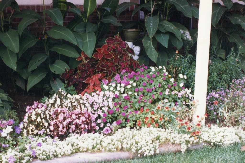 All of my gardens were veggies. I never considered planting flowers. I was first seriously introduced to flower gardens in 1986 when my newly minted wife planted flowers around our condo. Those flowers are shown below. Every year of our 35-year marriage, she planted lavish flower beds.