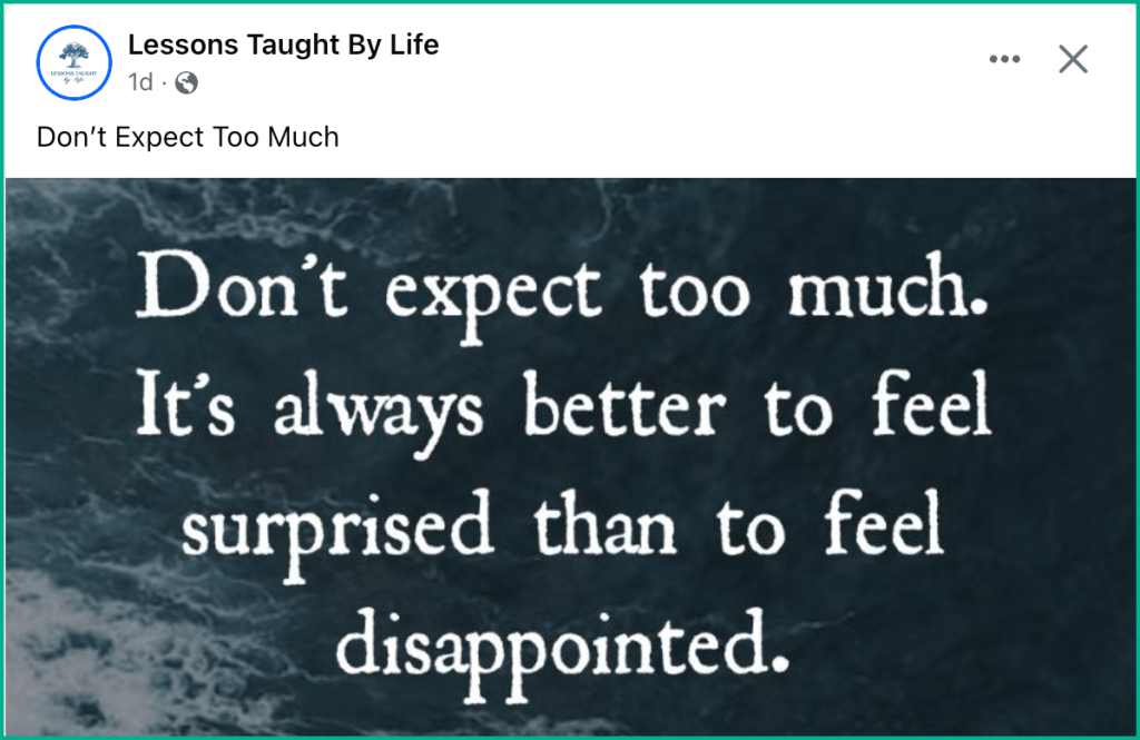 To me, it is “Expect the best, but don’t be too surprised if it doesn’t happen”