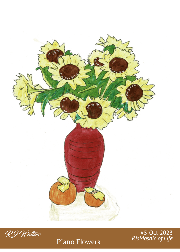 Analog Artsy is basically doing things the old-fashioned way (ie. without apps). I took an iPhone picture of the flowers on the piano of our entrance lounge area in my RetCom, and then put a piece of tracing paper on top of the photograph, to trace out the basic image I wanted to convey. From there, I experimented with several different media for the next step. This included: colored pencils, marking pens, water color and acrylic paint. I must say that I was near giving up, due to how messy most of these methods were. I finally settled on marking pens.