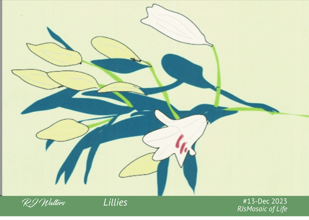 This mosaic started out as a small part of a picture I took from an arrangement of Christmas flowers. It started out by digitally tracing via vector graphics the part I wanted and then choosing colors to fill in the shapes.