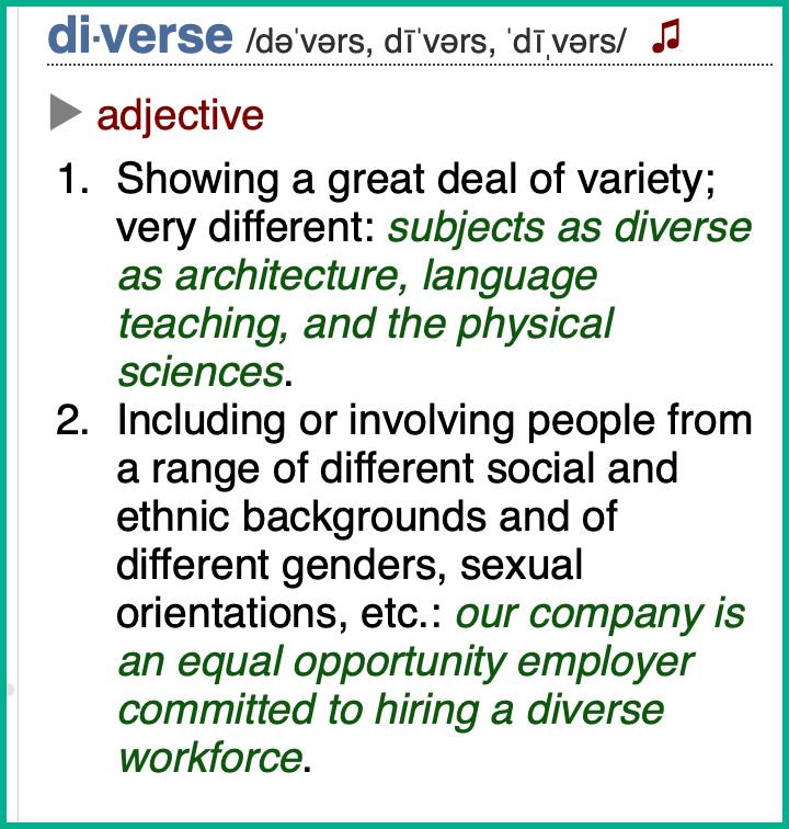 The definition of diversity is to be diverse, (pun intended) so I show you here what diverse means. This gives a pretty good description, but maybe it is more important to understand what is the opposite of diverse. Some of the opposites are: uniformity, sameness, monotony, drabness, dullness, tedium. If I had to choose between diverse, and not diverse, I would certainly choose the former.