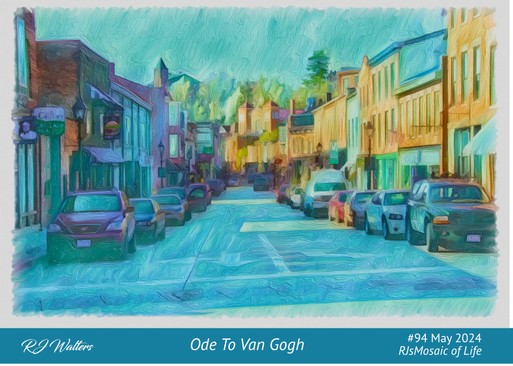 Yes, there are now apps that can mimic those of past artists. I used one of those apps on the mosaic above to give my photograph of a Galena Illinois street a Van Gogh-ish type flavor. I had an image in my mind’s eye of what I wanted it to look like. The morphing app did a pretty good job of meeting my expectations.