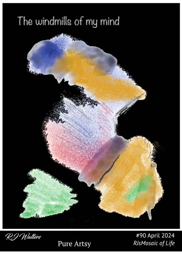 I have been in a playful mood lately, or maybe you could call it infantile creative mood. I have been on a serious search for Artsy tools and so far have found ten good ones. This mosaic was made with one of them. I tried to clear my mind of anything of this world and just go crazy with my iPad pen. When I was done it looked like I was trying to draw a windmill. I have been watching House Hunters International quite a bit lately, so maybe that had something to do with it.