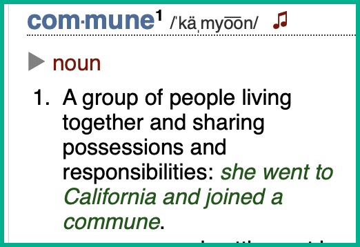 it is likely that the word commune has been demonized because of capitalism. living communally, sharing things and entertaining, immersing yourself with your special interests and being social in organic ways is a special interest of mine. i have studied it by reading dystopias and protopias (& all in between). zombie movies are always a commentary or critique of forces that interfere with or prevent this kind of lifestyle.