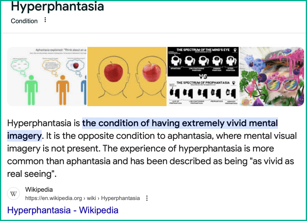 Getting to the physical side of mental imagery, I found it fascinating the about 1% of people have no ability to form visual images in their minds, while almost 3% can vividly see images. Most of us are stuck somewhere in between.