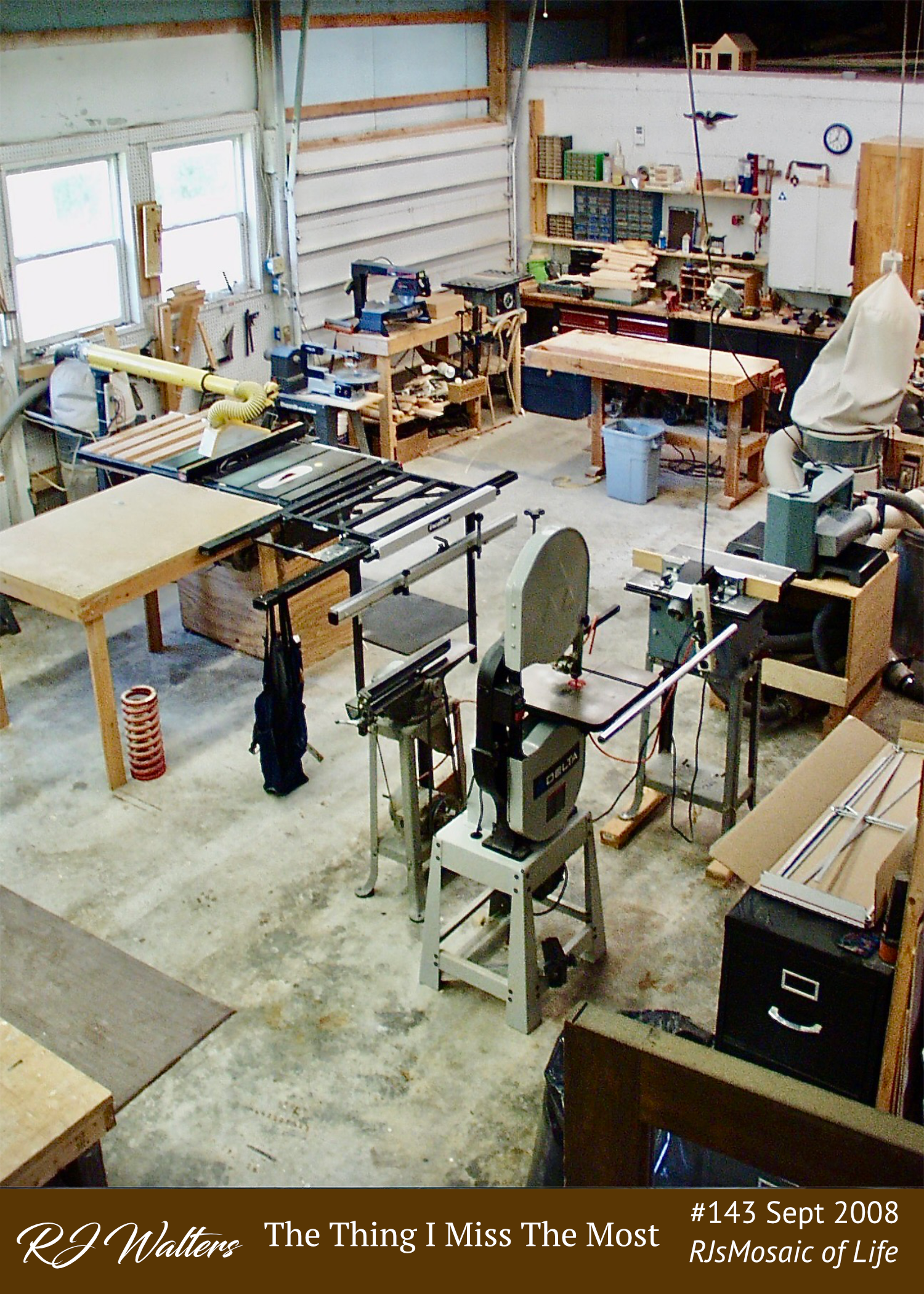 I was careful to precisely state the title of this mosaic. The “thing” I miss the most in my life is the 1800 sq ft workshop that I left behind when I moved into my RetCom in 2021. I built it in the year 2000 from a pole barn filled with manure, chicken coops, and such. I successfully ran a woodworking business in it for six years before officially retiring from a for-profit business.