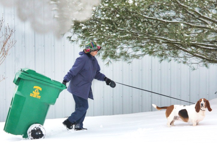 Except for cooking, which I was the primary chef in our household, everything inside the house, my wife had veto-power. Outside the house, except for her flower gardens, I had the veto power and duties. One of those duties was to take the trash barrel out to the roadside and pick it up after it was emptied. I always did that, except for slippery conditions. The picture above was one of those times.