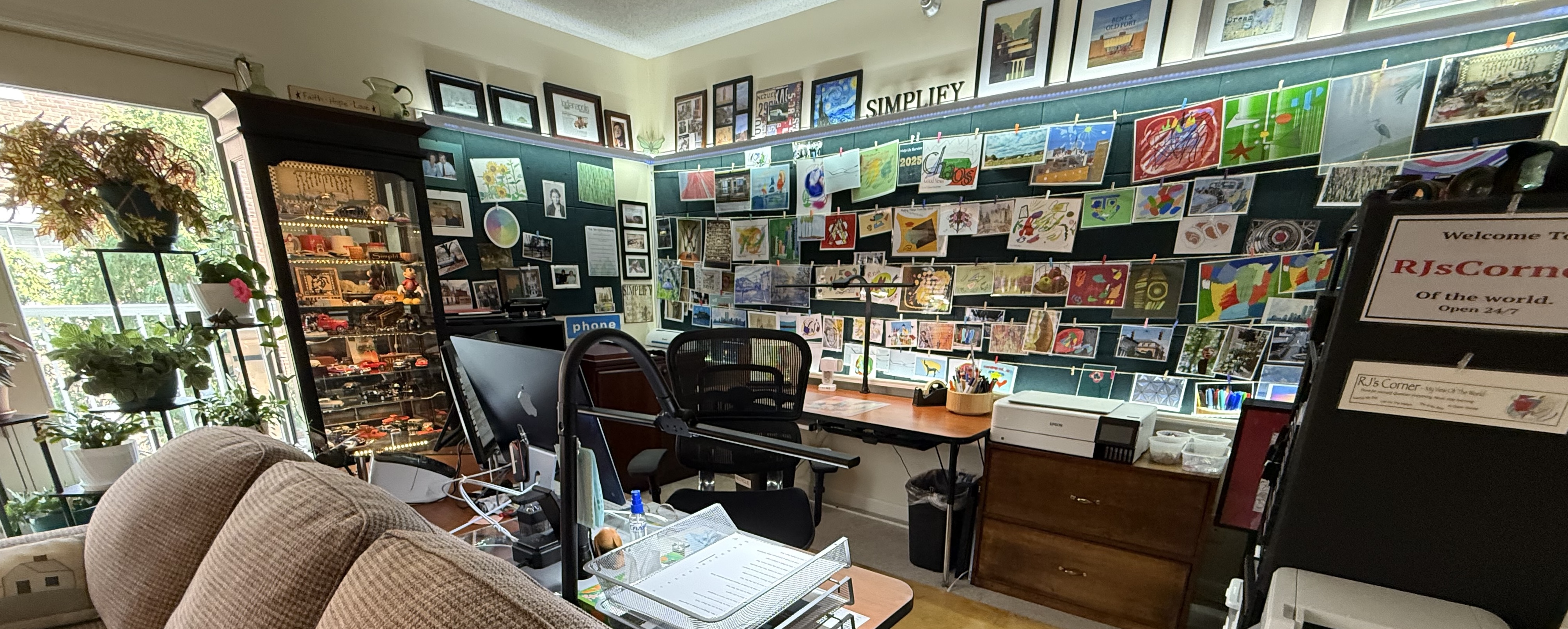 I don’t like tight fitting or scratchy clothes, and I hate being in crowds but the place I’ve spent most of my time in the last 15 years or so has always been my private cocoon. When I moved to my current retirement community apartment four years ago, I established the next version. It is 8′ x’12’ area that is filled to the brim with all my tools/toys needed for RJsCorner including my artsy place.