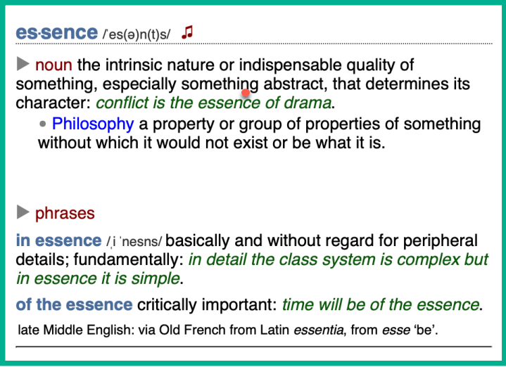 My favorite philosopher is Aristotle and he had much to say about essence. Perhaps his most insightful quote in that arena is: