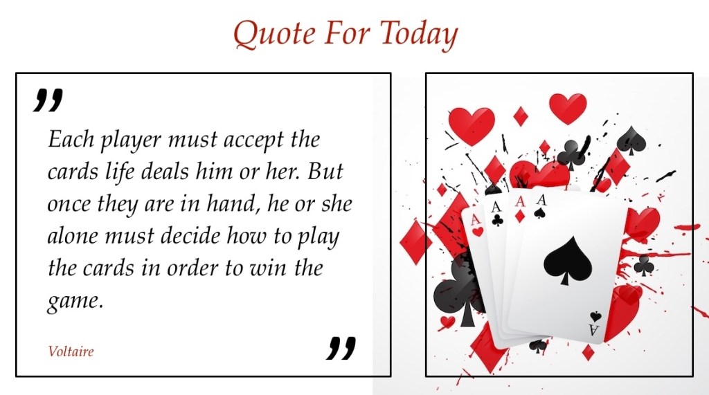 I know it depends on your age but to me these words brought to mind a popular song by Kenny Rogers in 1978 entitled “The Gambler”. Who knew the words came from Voltaire in the early 1700s.